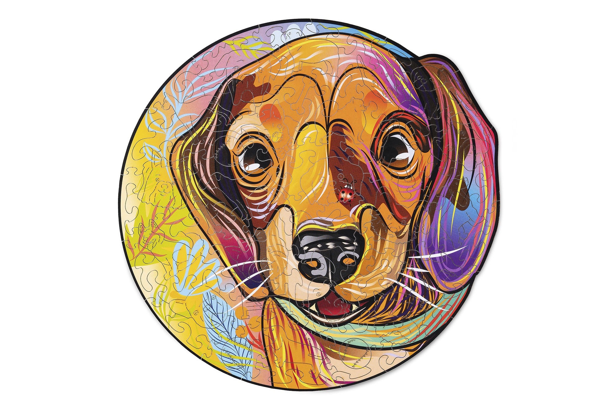 Puzzle-ul Charlie the Dachshund conține 107 piese, fiecare tăiată cu precizie și colorată în nuanțe curcubeu vii.