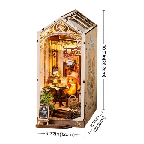 Vei fi încântat de detaliile atent realizate: meniuri pe tablă, espressor realist, dulapuri din lemn, plante decorative și mici deserturi care dau viață acestei cafenele în stil curte interioară. Ferestrele largi oferă o vedere laterală rar întâlnită la book nook-uri, ceea ce îl face perfect ca suport decorativ pentru cărți sau piesă de expunere pe birou, masă, raft sau șemineu.