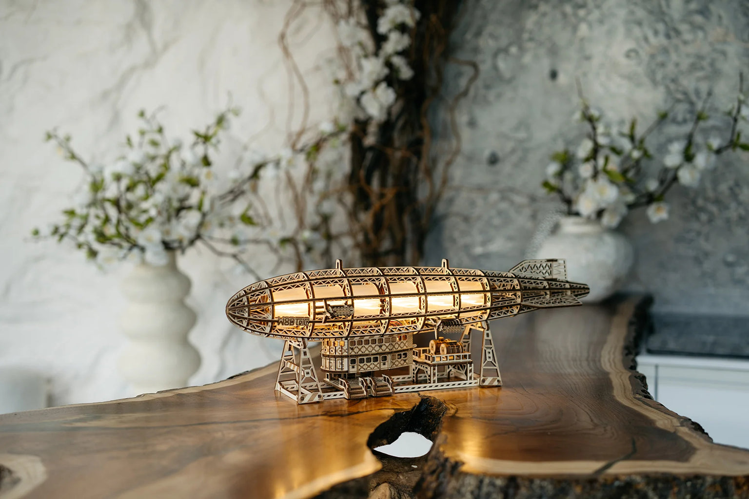 Luminous Zeppelin de la WoodTrick este un puzzle 3D din lemn care se transformă într-o lampă funcțională cu design retro.