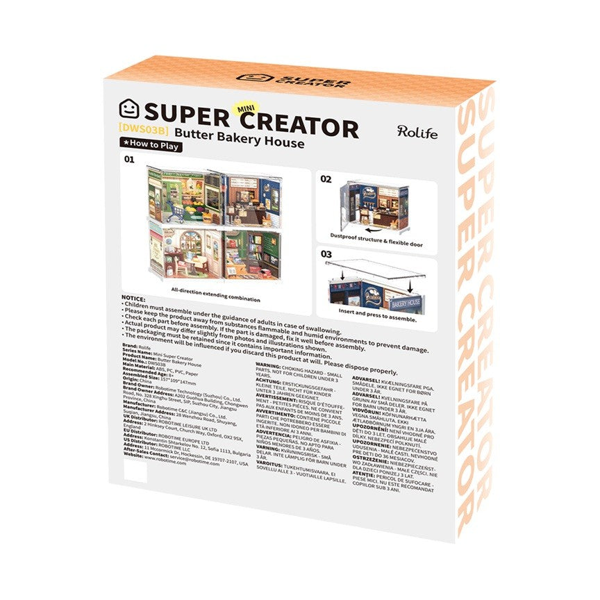 Bucură-te de delicii la Rolife Butter Bakery House – casa miniaturală DIY. În interior vei găsi pâine cu maia, franzeluțe, bagels și produse de patiserie fragede, toate parfumate și coapte proaspăt în fiecare zi. De asemenea, te așteaptă gemuri și gogoși pentru a-ți satisface pofta de dulce. Alege-ți preferatele, iar brutarul ți le va împacheta cu grijă în cutiuțele adorabile pentru take-out, ștampilate cu logo-ul brutăriei.
