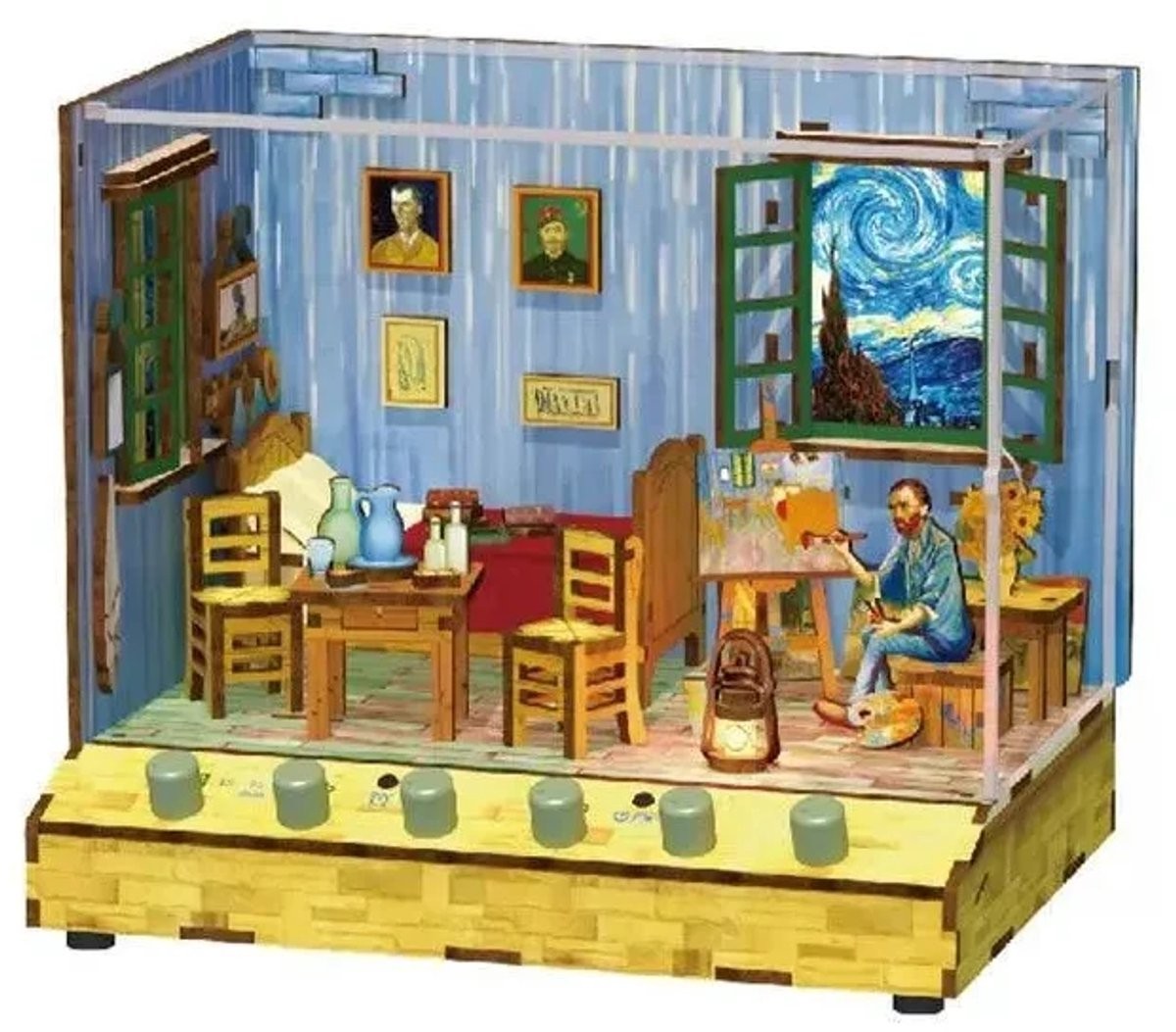 Este un produs aparte, cu o identitate vizuală puternică și o valoare decorativă evidentă. Scena reinterpretată în miniatură păstrează elemente care evocă imediat opera lui Van Gogh: camera simplă, accentele artistice, atmosfera caldă și senzația de intimitate creativă. Tocmai această apropiere de universul pictorului face modelul atât de special.