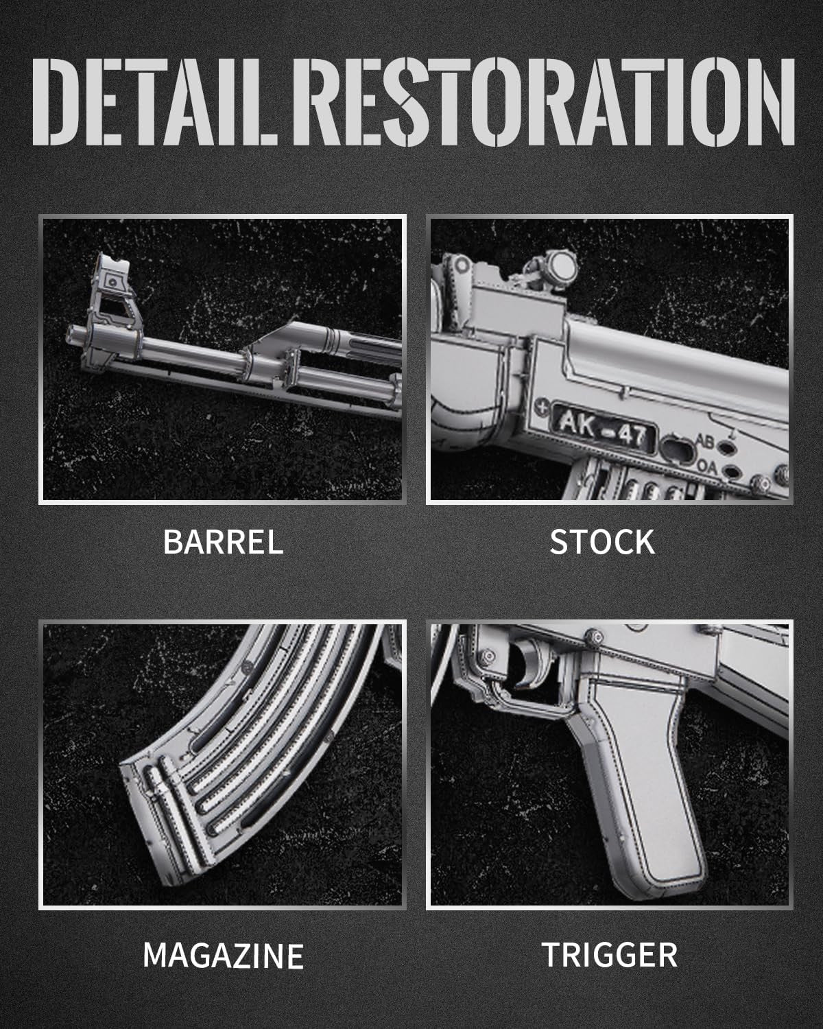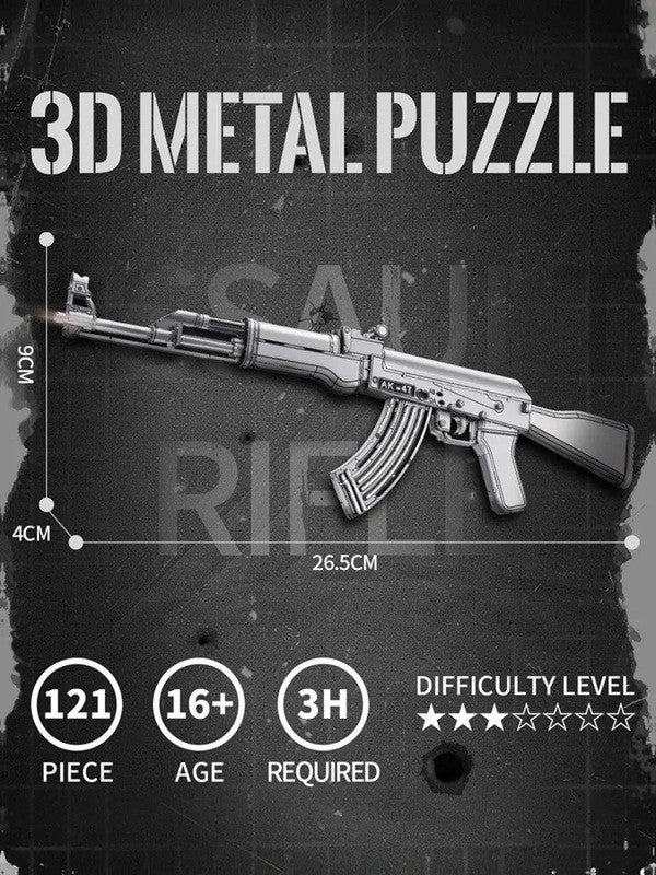 Puzzle-ul metalic 3D AK47 este conceput pentru adolescenți și adulți (14+). Montajul durează aproximativ 6 ore, oferind o combinație perfectă între provocare, relaxare și sentimentul de împlinire după finalizarea modelului.