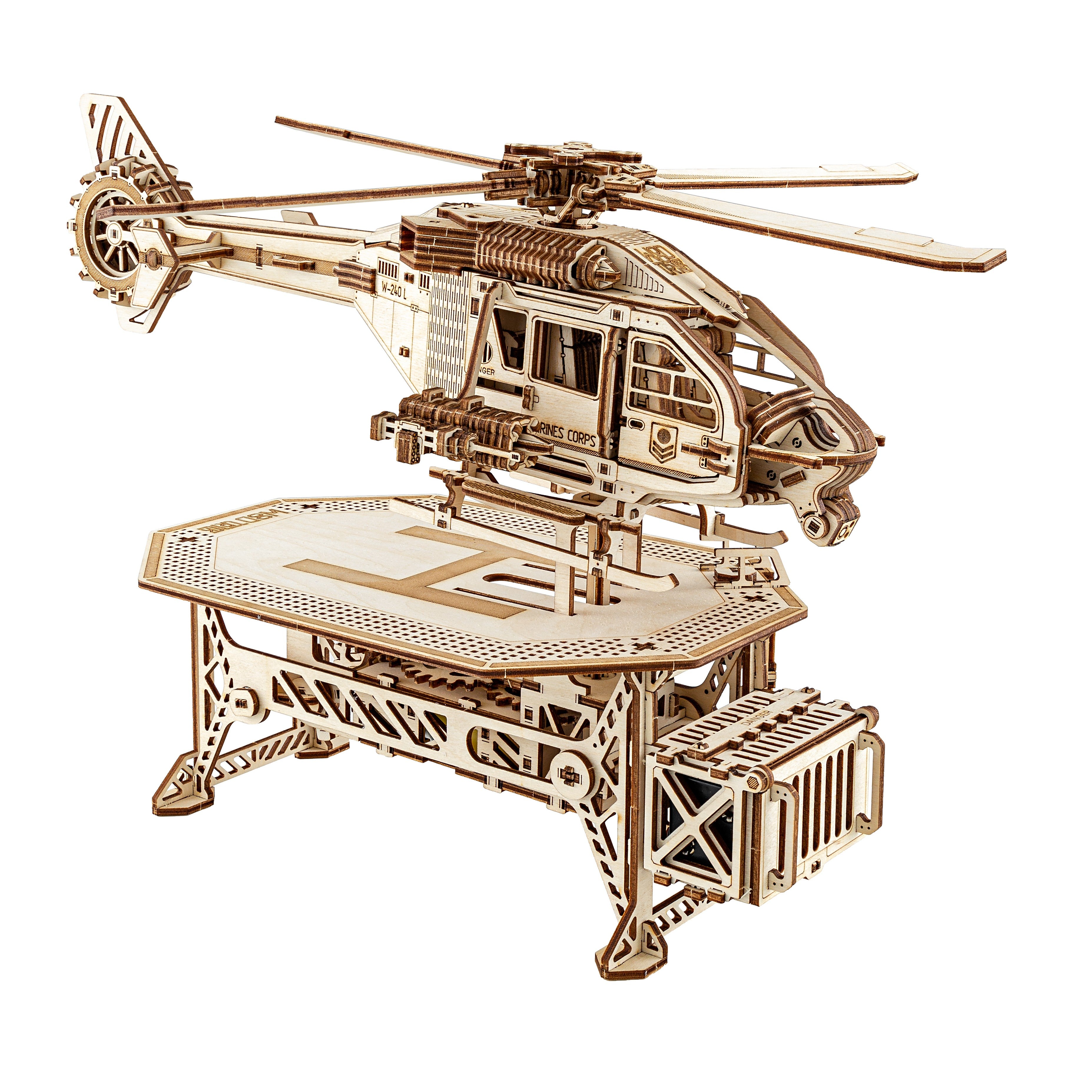 Acest puzzle 3D din lemn include elice rotative, rotor de coadă, cockpit complet detaliat, lansatoare de rachete și chiar o platformă de decolare.