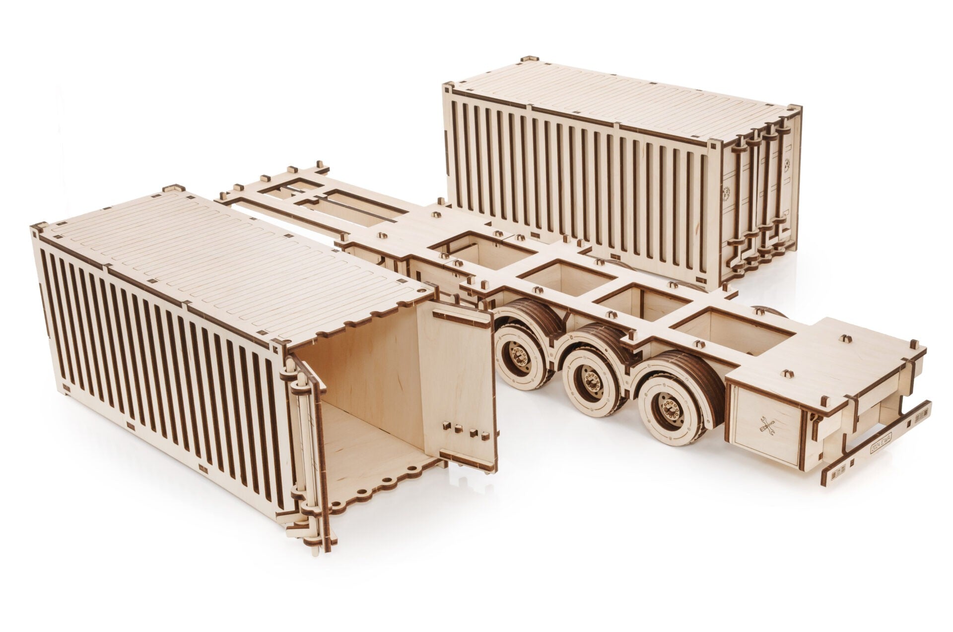 Set de construcție cu 238 de piese, fiecare tăiată cu precizie, care formează baza platformei și loc pentru două containere.