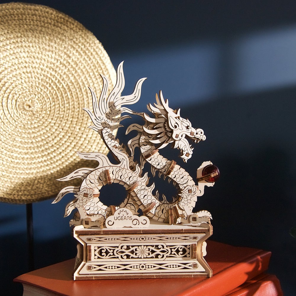 Intră în universul simbolurilor orientale cu Wood Dragon de la Ugears, un model 3D din lemn inspirat de reprezentările tradiționale ale dragonului din arta chineză. Acest puzzle DIY îmbină eleganța decorativă cu un mecanism ingenios și este conceput ca o piesă specială de expunere, dar și ca o mică cutie secretă pentru mesaje sau obiecte prețioase. Dragonul este așezat pe un suport decorativ și poate fi admirat atât împreună cu baza, cât și separat, deoarece este complet detașabil.