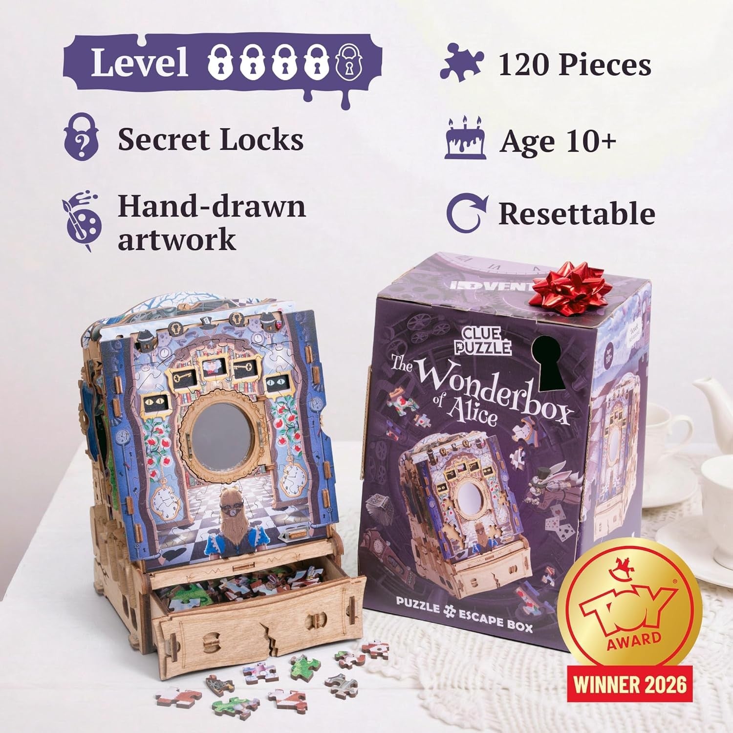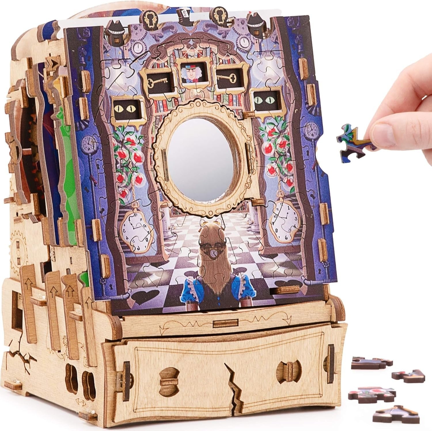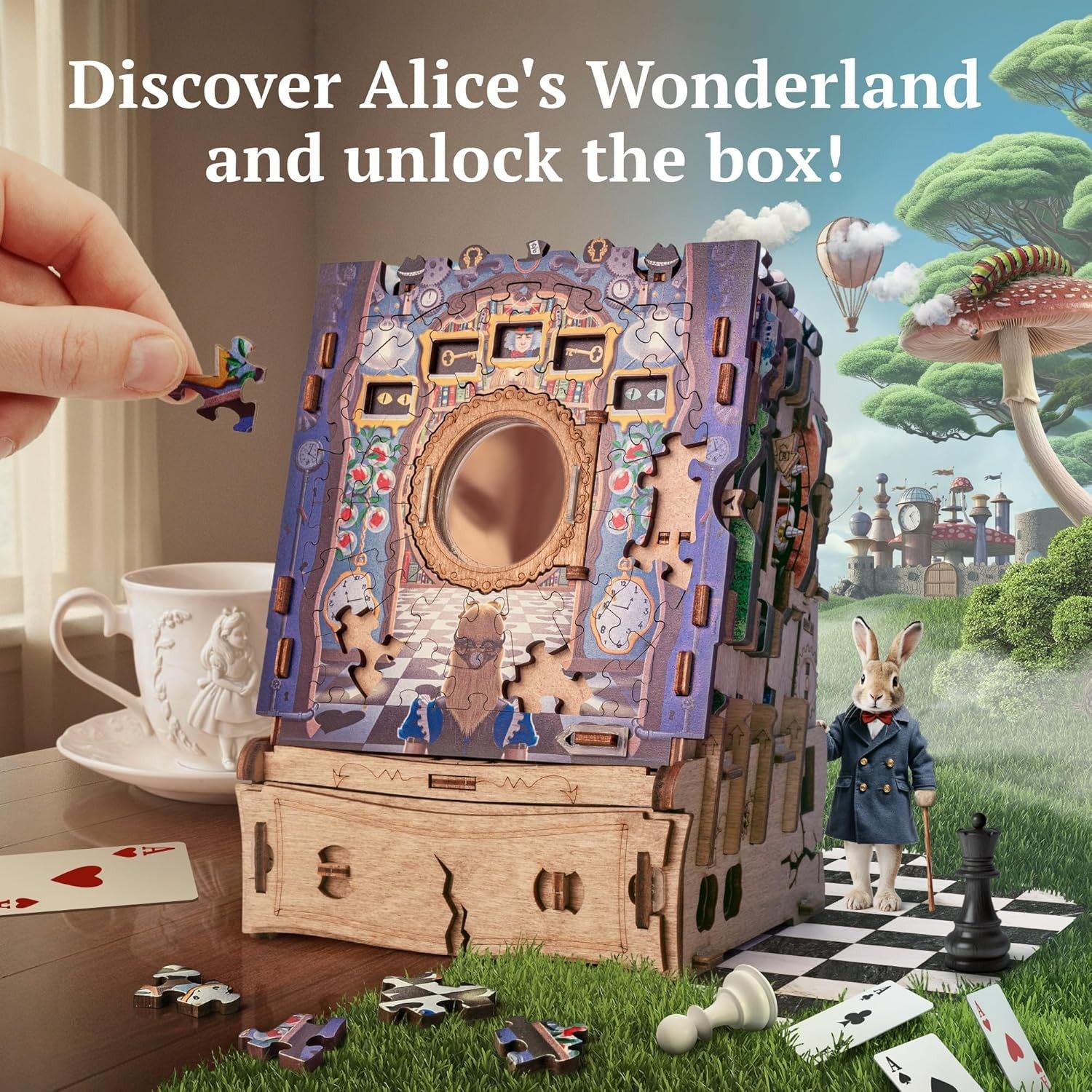 Nu este un puzzle obișnuit pe care îl asamblezi și apoi îl pui deoparte, ci o experiență completă, mai complexă decât un jigsaw clasic. Pe măsură ce reconstruiești scenele inspirate din aventurile lui Alice, activezi mecanisme secrete și descoperi noi pași ai provocării. Rezultatul este o aventură captivantă, ideală pentru cei care caută un joc cu adevărat memorabil sau un cadou original pentru pasionații de enigme.