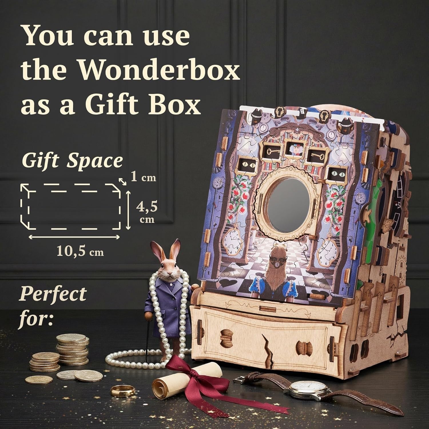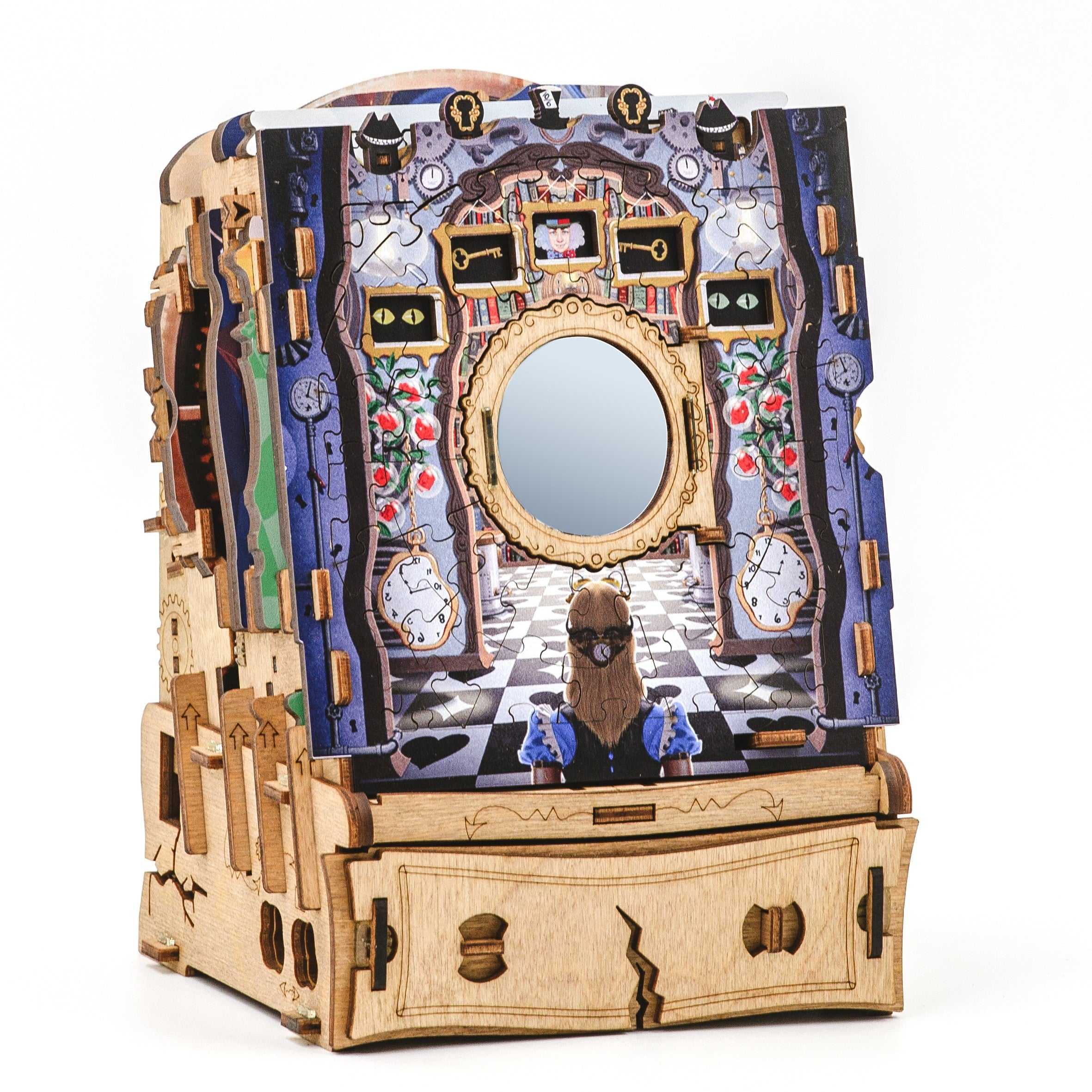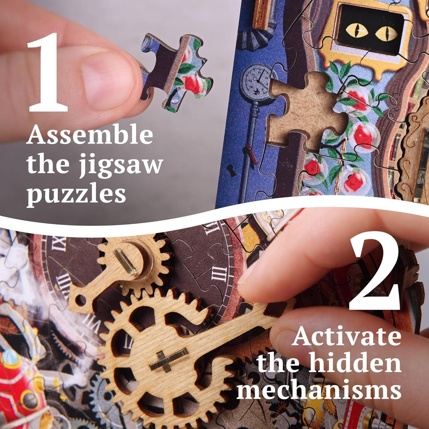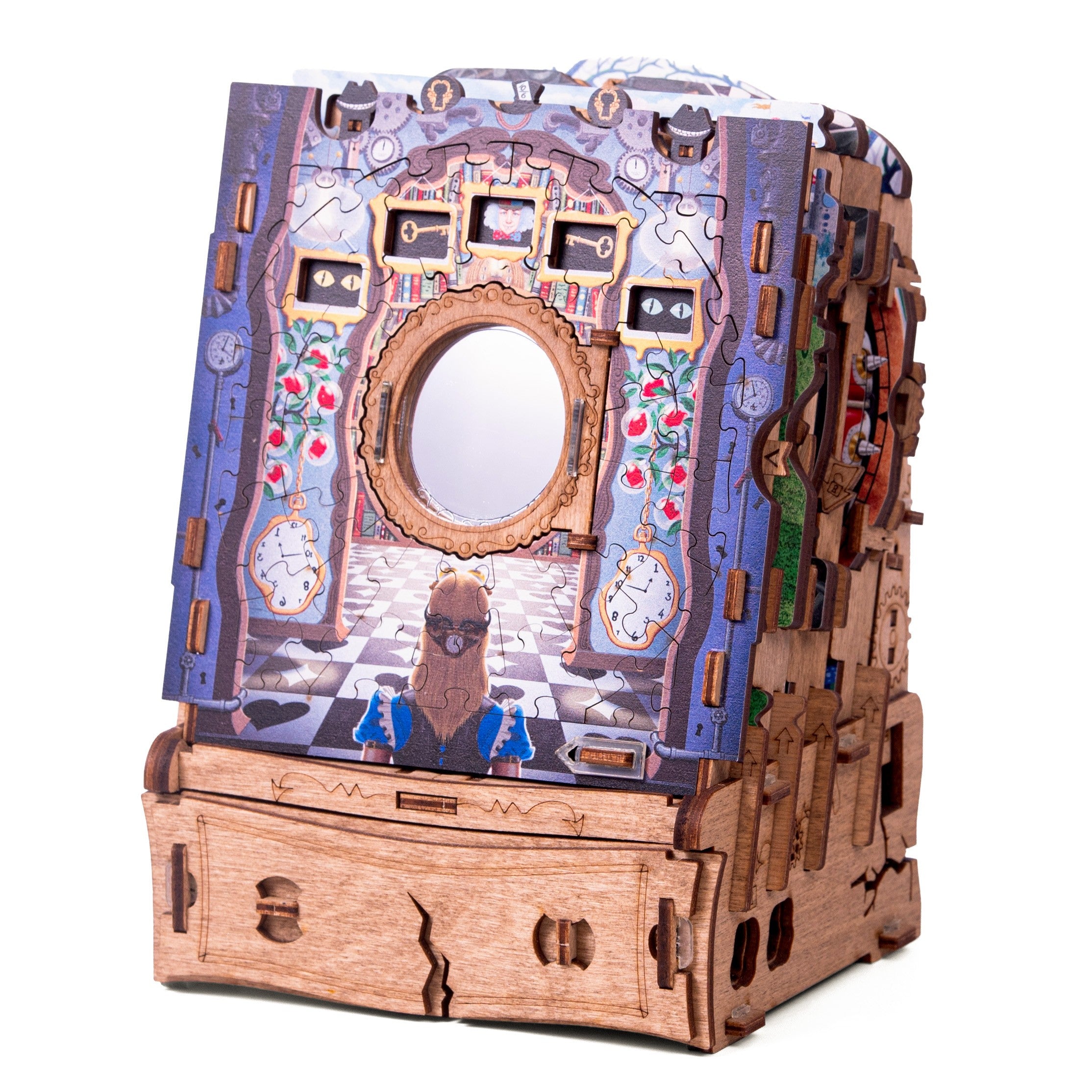 Nu este un puzzle obișnuit pe care îl asamblezi și apoi îl pui deoparte, ci o experiență completă, mai complexă decât un jigsaw clasic. Pe măsură ce reconstruiești scenele inspirate din aventurile lui Alice, activezi mecanisme secrete și descoperi noi pași ai provocării. Rezultatul este o aventură captivantă, ideală pentru cei care caută un joc cu adevărat memorabil sau un cadou original pentru pasionații de enigme.