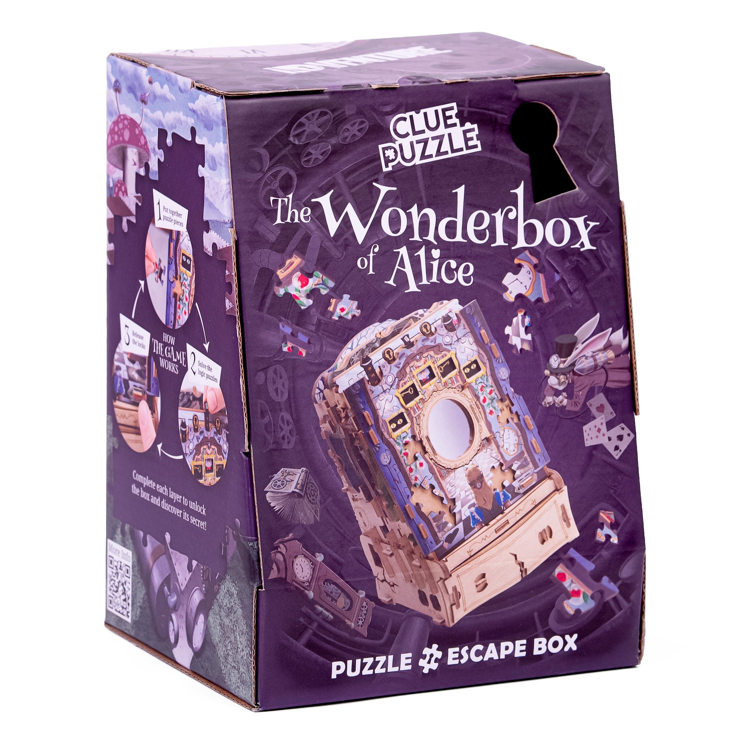 Cutia fermecata a lui Alice este alegerea perfectă pentru cei care iubesc puzzle-urile inteligente, universul fantastic al lui Alice și experiențele de tip escape room. Acest model combină într-un mod original un puzzle de tip jigsaw cu o cutie interactivă plină de mecanisme ascunse, astfel încât fiecare piesă montată te apropie de următorul indiciu și de deschiderea finală a cutiei.