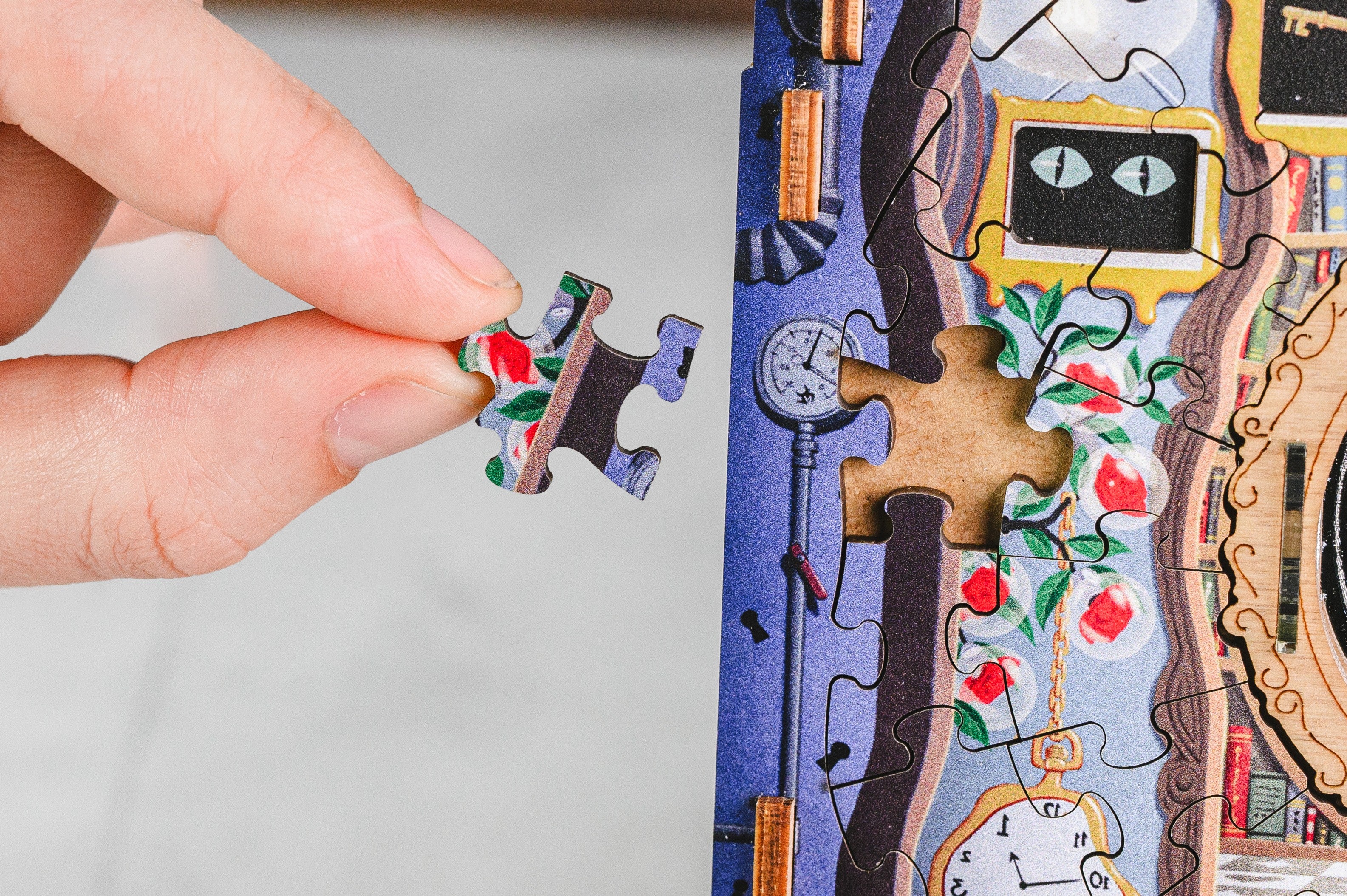Un mare plus este că, după ce provocarea a fost rezolvată, produsul rămâne și o piesă decorativă spectaculoasă. În loc să fie lipit sau depozitat, puzzle-ul devine un obiect de expus, cu design elegant și tematică inspirată din lumea lui Lewis Carroll.