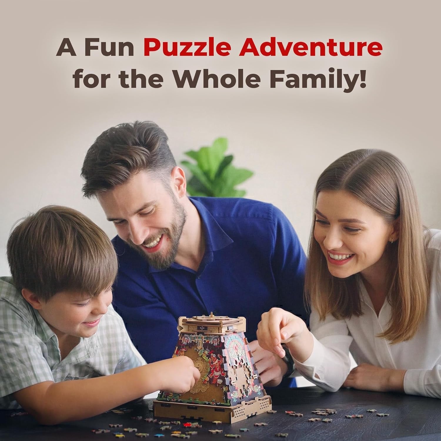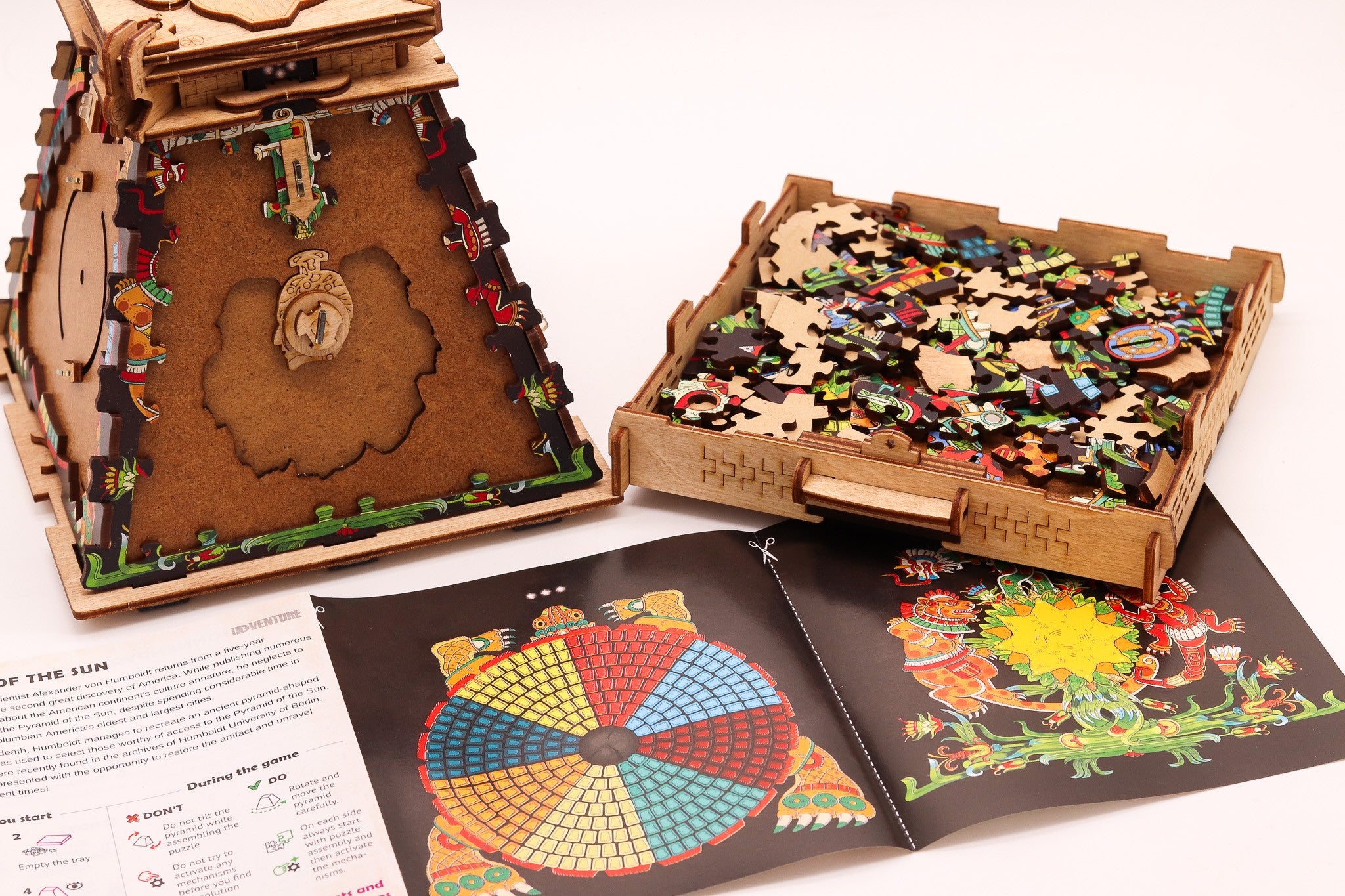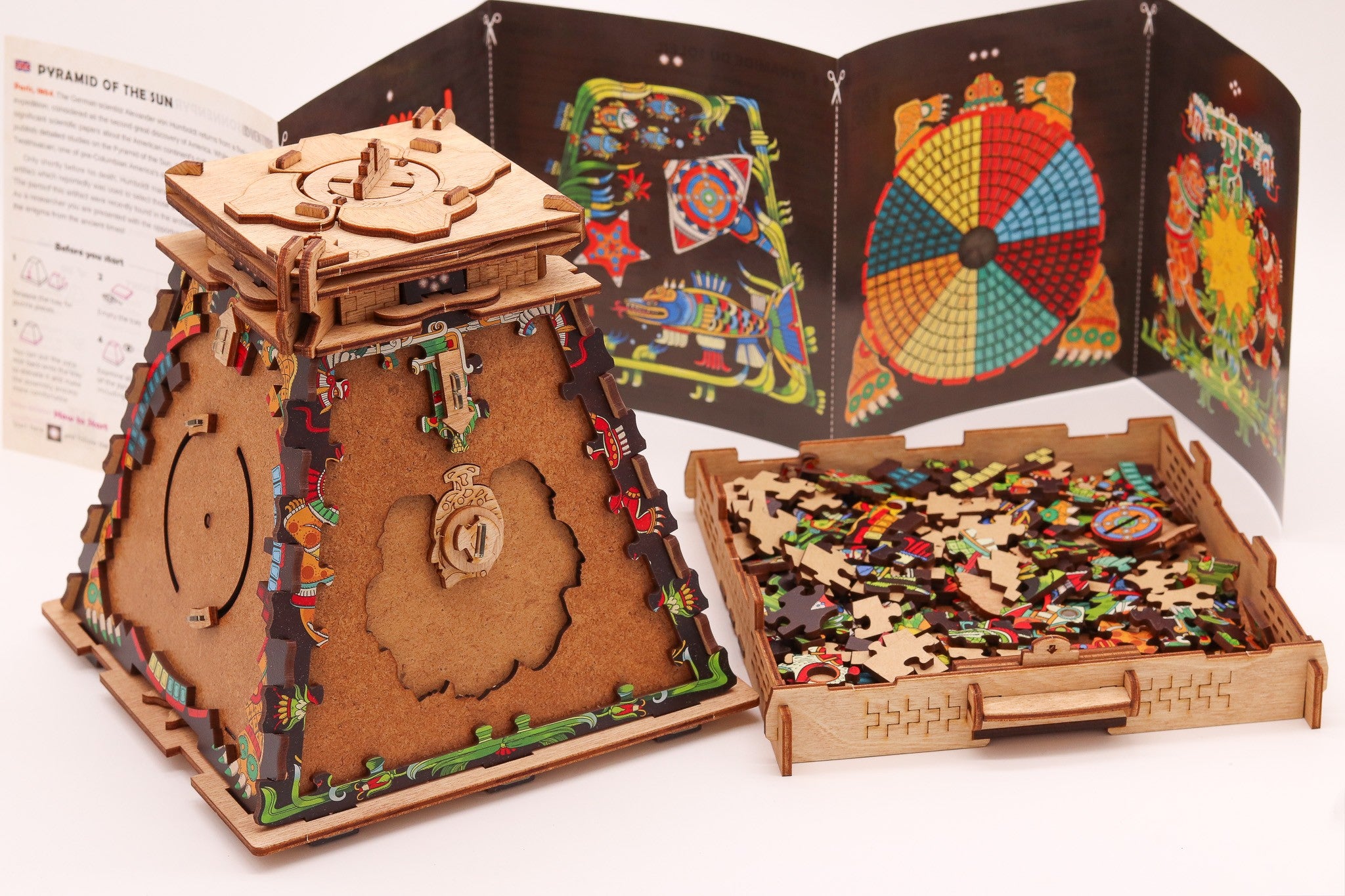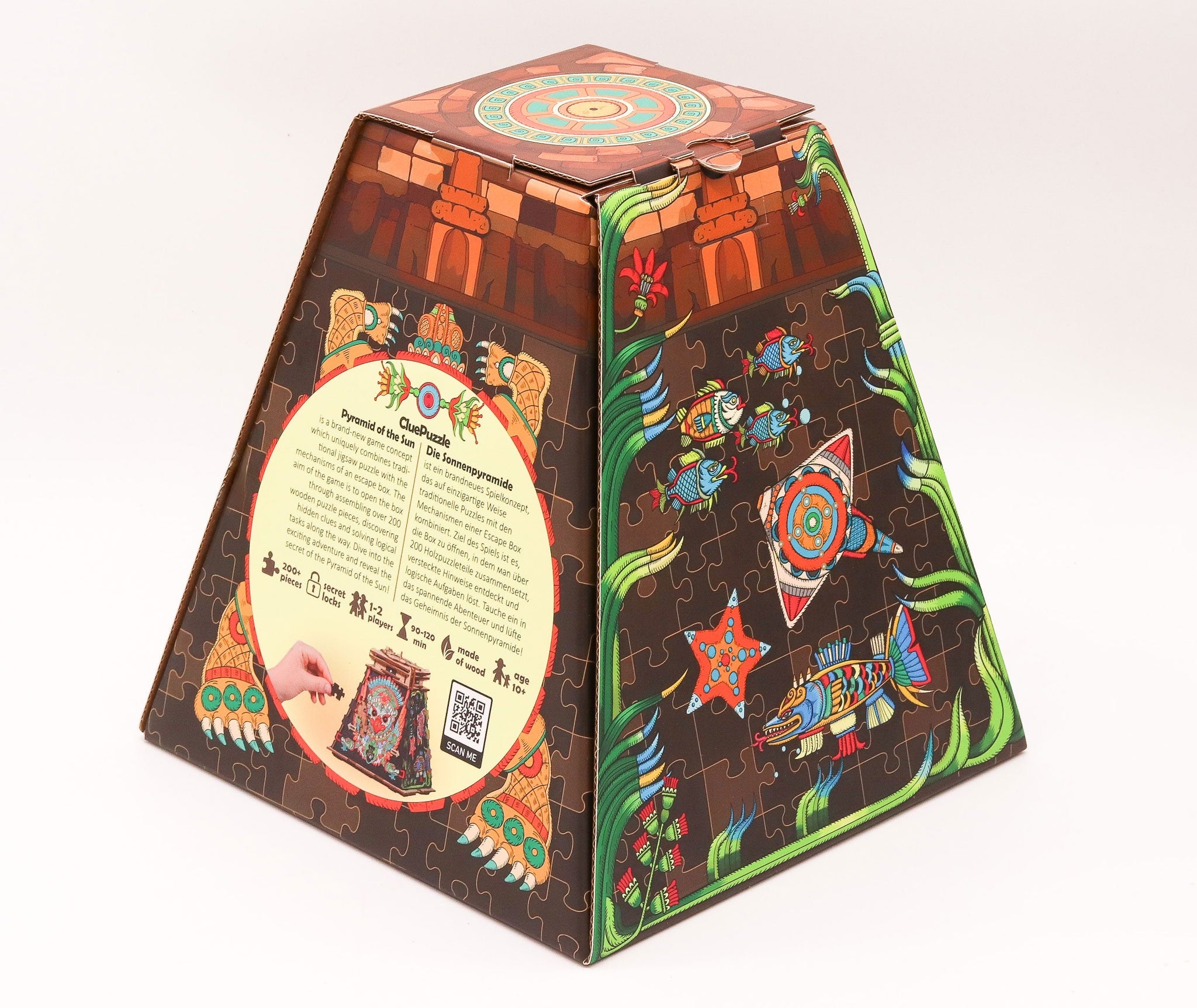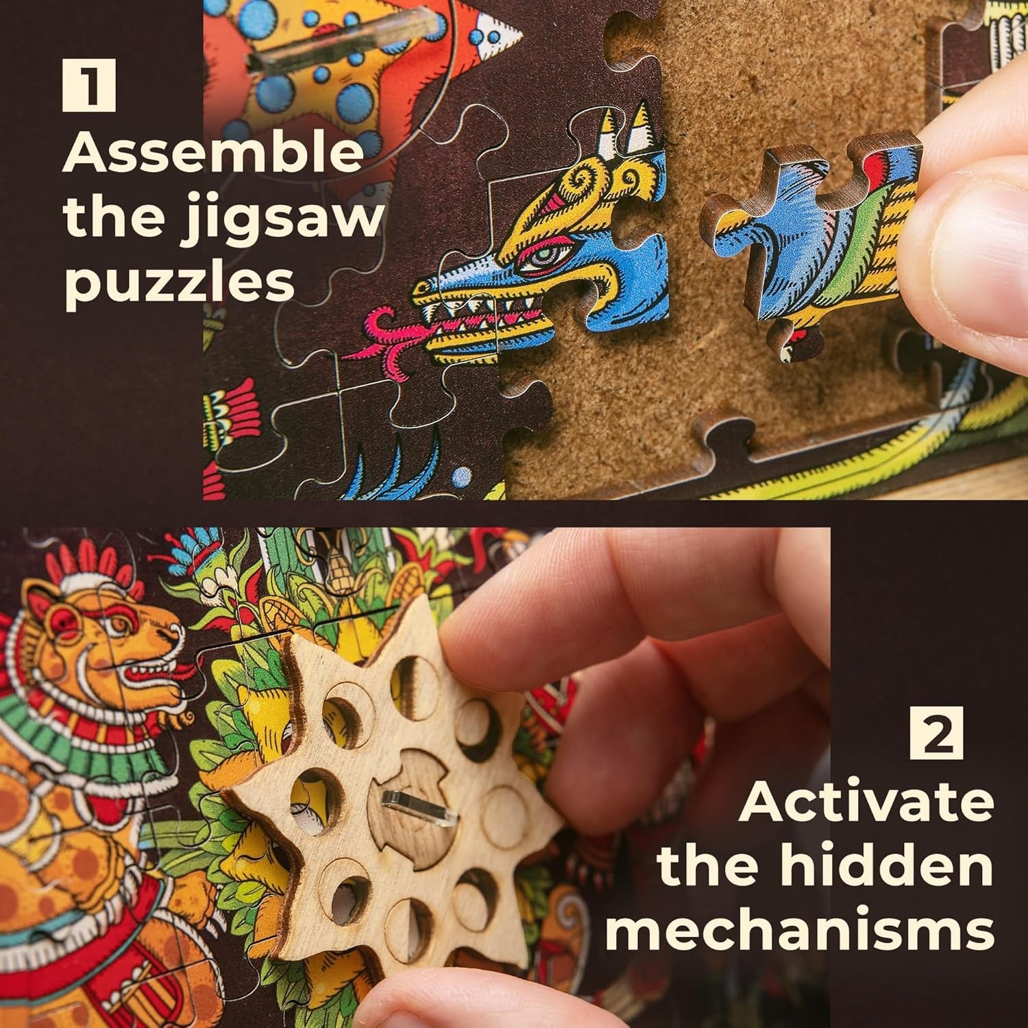 Nu este un puzzle obișnuit care se rezolvă rapid, ci o experiență completă de 90–120 de minute, creată pentru a oferi suspans, satisfacție și provocări memorabile. Tematica inspirată de Piramida Soarelui și designul cu influențe de artă indigenă transformă fiecare etapă într-o experiență captivantă, potrivită atât pentru serile de joc, cât și pentru a fi oferită cadou.