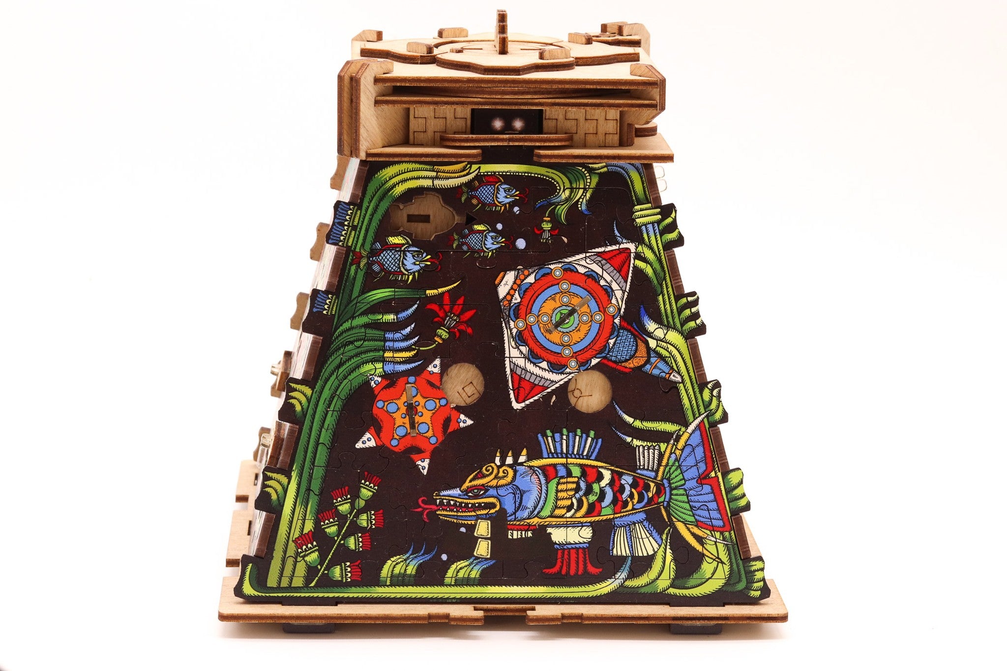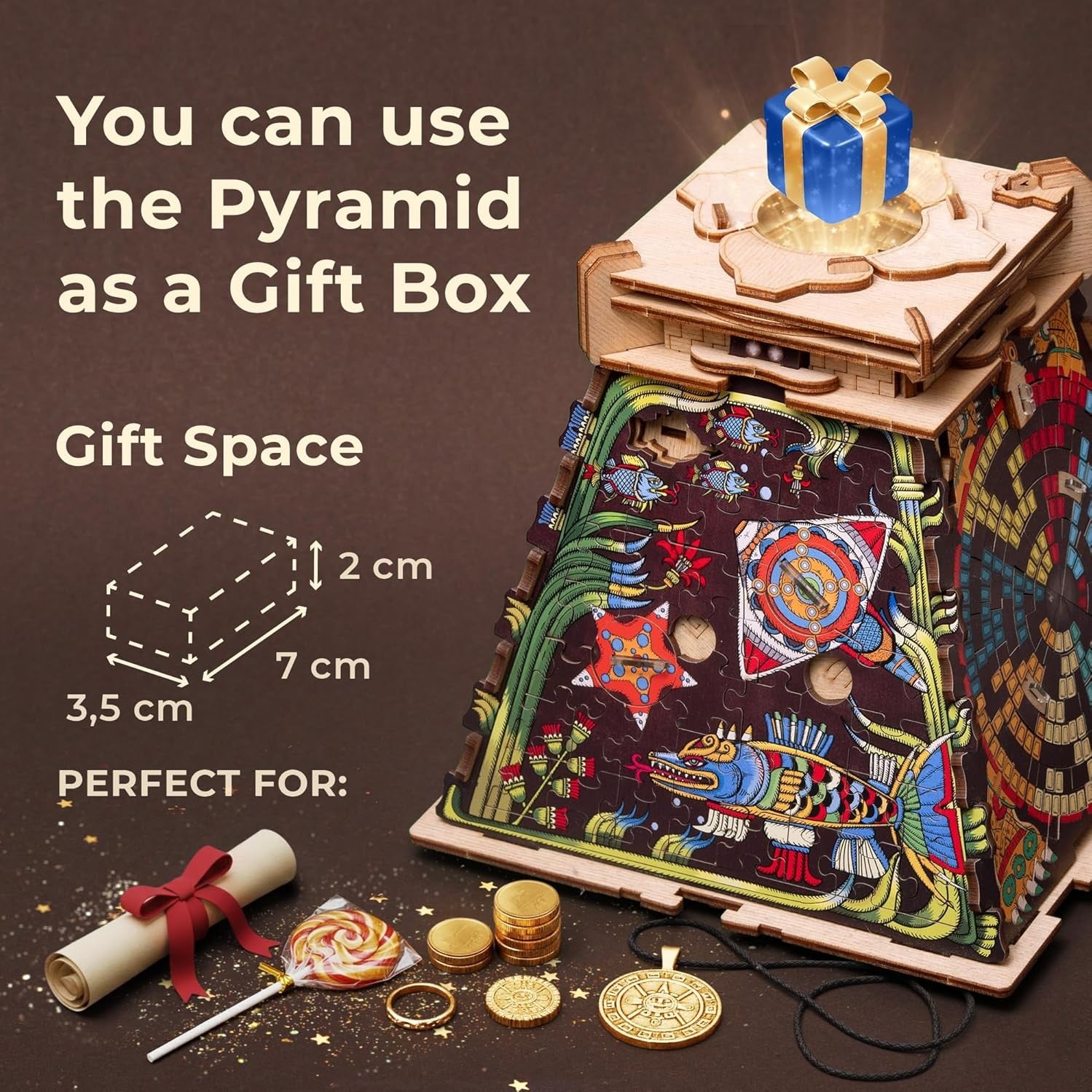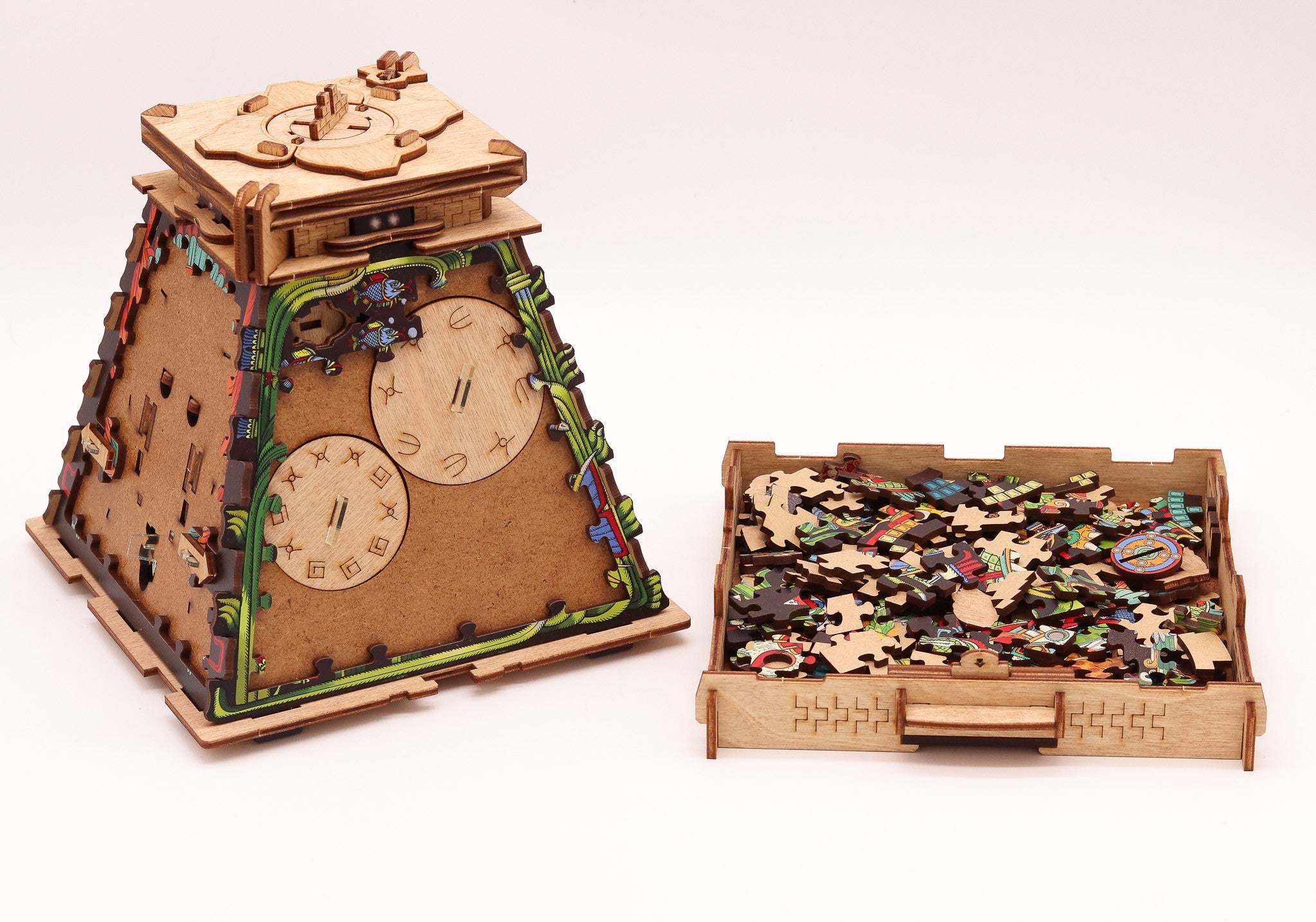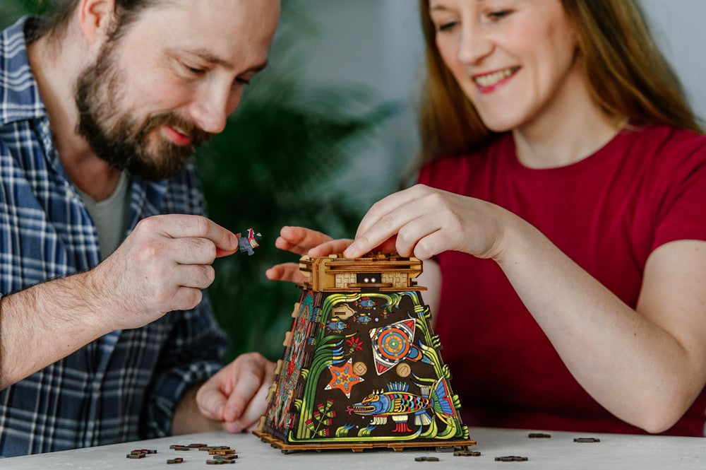Puzzle-ul 3D – Pyramid of the Sun este alegerea perfectă pentru cei care iubesc puzzle-urile inteligente, misterele antice și experiențele de tip escape room. Acest model combină ingenios o Cluebox cu un jigsaw puzzle 3D, oferind o aventură originală în care trebuie să asamblezi, să descifrezi și să deblochezi mecanismele ascunse pentru a descoperi misterul civilizației aztece.